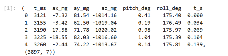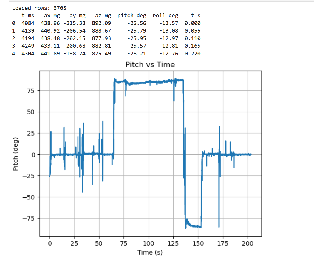 - Stored each sample with a timestamp and both sensor axes (e.g., t_ms, ax_mg, ay_mg, az_mg, gx, gy, gz), keeping accel and gyro aligned by time.