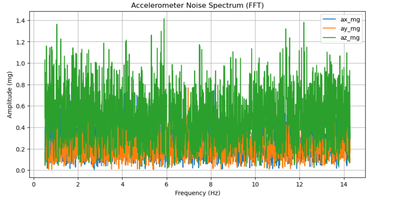 Figure 9 Accelerometer Noise Spectrum (FFT) # --- Core: estimate sampling rate + compute/plot FFT amplitude spectra (ax/ay/az) --- t = df["t_ms"].to_numpy(dtype=float) * 1e-3 t -= t[0] fs = 1.0 / np.median(np.diff(t)) def amp_spectrum(x, fs): x = x - np.mean(x) n = len(x) X = np.fft.rfft(x) f = np.fft.rfftfreq(n, d=1/fs) A = (2.0 / n) * np.abs(X) A[0] *= 0.5 return f, A plt.figure(figsize=(10,5)) for k in ["ax_mg","ay_mg","az_mg"]: f, A = amp_spectrum(df[k].to_numpy(dtype=float), fs) m = (f >= 0.5) & (f <= min(200, fs/2)) plt.plot(f[m], A[m], label=k) plt.xlabel("Frequency (Hz)") plt.ylabel("Amplitude (mg)") plt.title("Accelerometer Noise Spectrum (FFT)") plt.grid(True) plt.legend(loc="best") plt.show()Code Snippet (Gist)