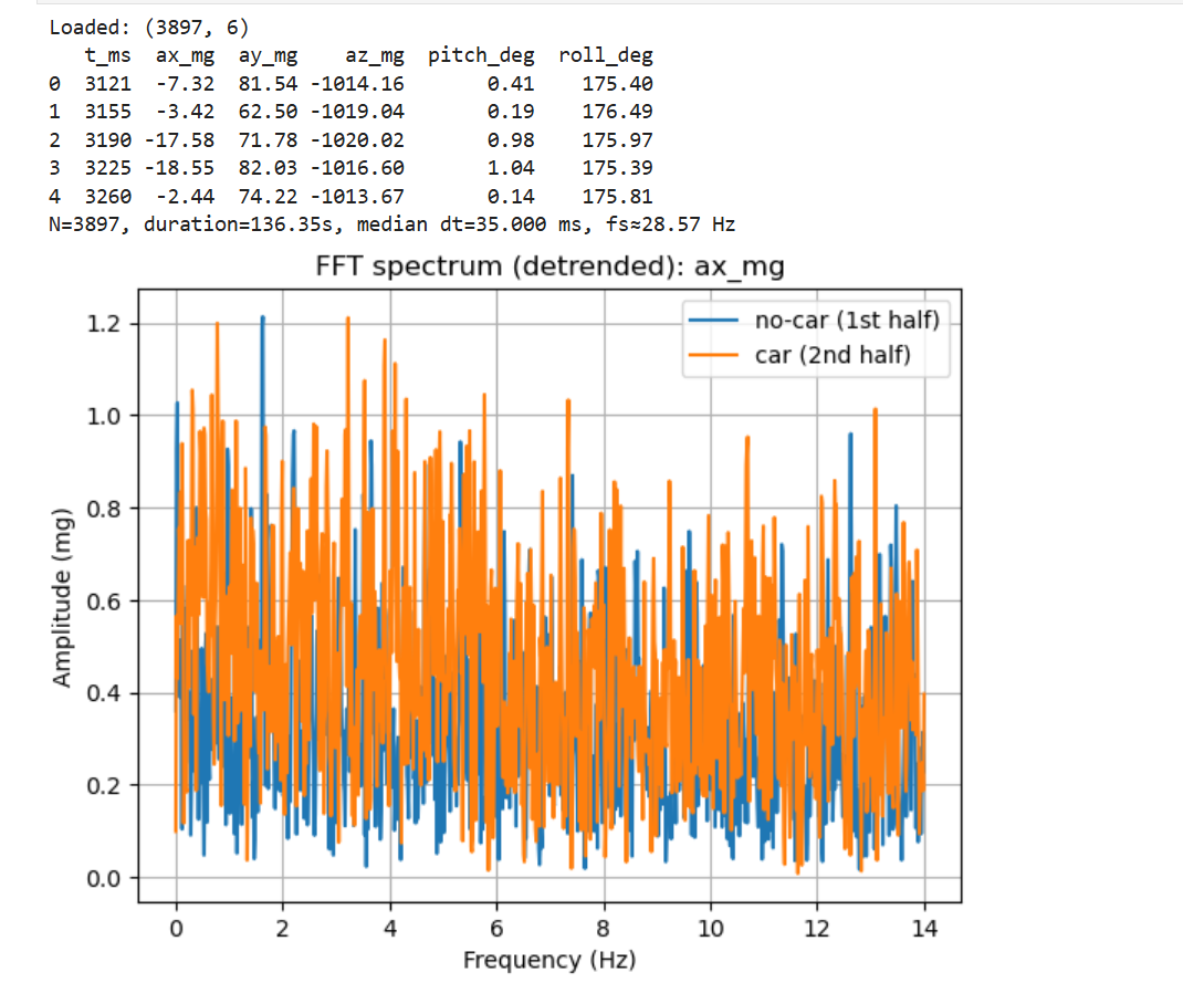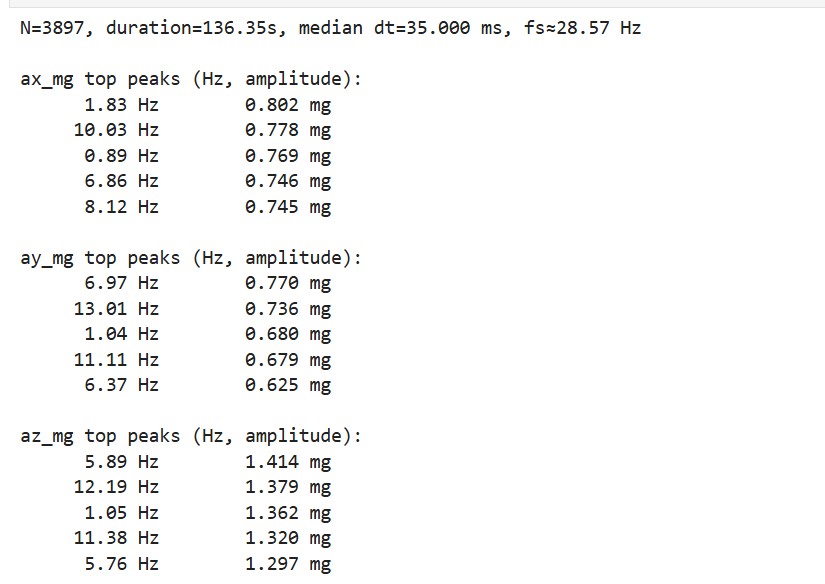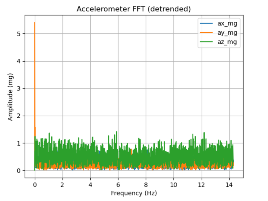 An FFT was computed for each accelerometer axis using a sampling rate estimated from the median time step (N = 3897, duration = 136.35 s, median dt = 35.000 ms, fs ≈ 28.57 Hz). The dominant peaks were mainly below ~14 Hz: ax peaks at 1.83 Hz (0.802 mg) and 10.03 Hz (0.778 mg); ay peaks at 6.97 Hz (0.770 mg) and 13.01 Hz (0.736 mg); az peaks at 5.89 Hz (1.414 mg) and 12.19 Hz (1.379 mg).