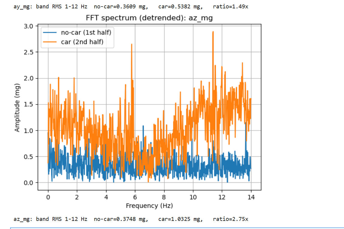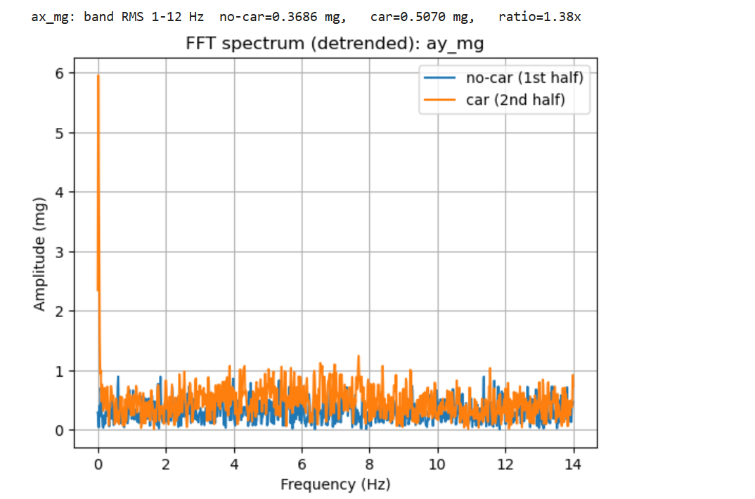 To evaluate the effect of the RC car, the recording was split into two halves: no-car (1st half) and car nearby (2nd half). In the 1–12 Hz band, ax RMS increased from 0.3686 mg (no-car) to 0.5070 mg (car), i.e., a 1.38× increase.