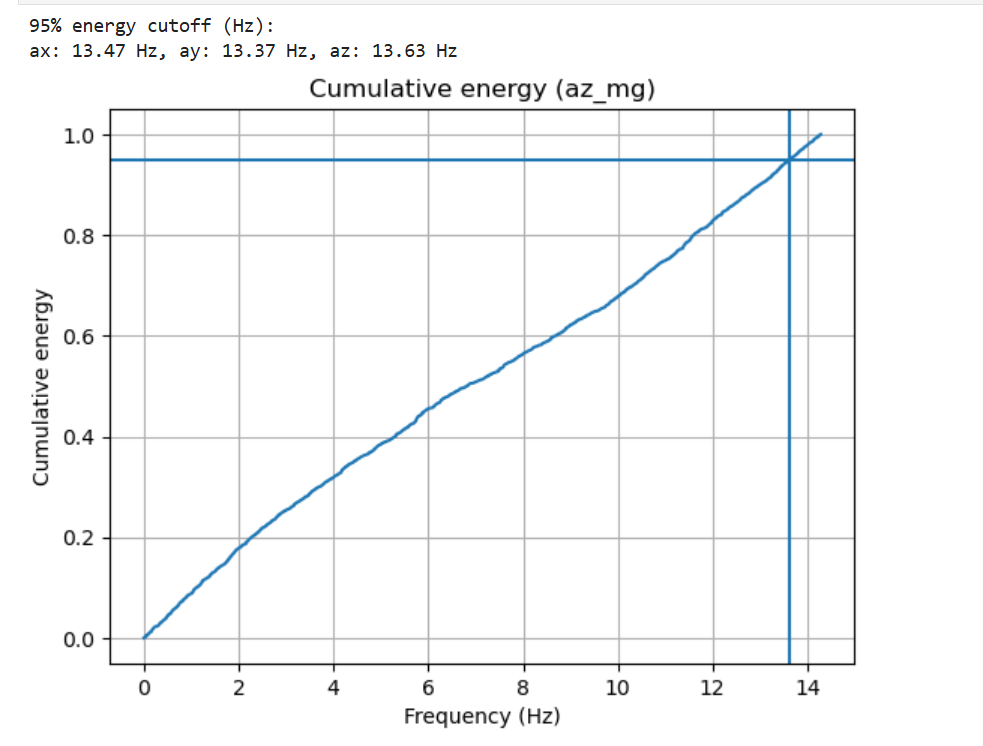A cutoff frequency was selected using cumulative spectral energy: the 95% energy points are 13.47 Hz (ax), 13.37 Hz (ay), and 13.63 Hz (az). Therefore, a low-pass cutoff of 13 Hz was chosen to retain nearly all motion-related content while attenuating higher-frequency noise. Lower cutoffs would further smooth the signal but risk attenuating legitimate dynamics, whereas higher cutoffs would pass more vibration noise, reducing angle stability.
