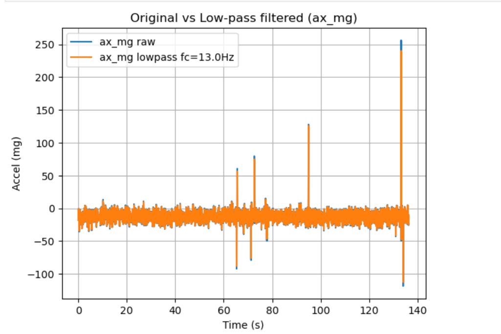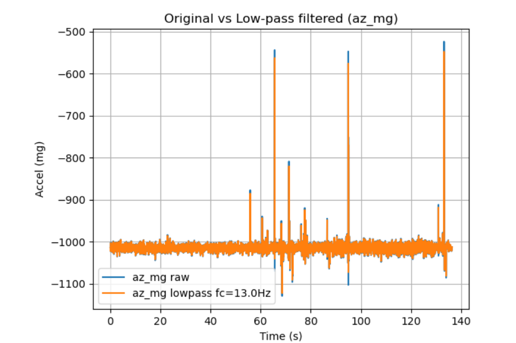 Figure 18 Original vs Low-pass Filtered Accelerometer (az_mg) Across all three axes, the low-pass filter reduces high-frequency fluctuations while preserving the slower baseline/step changes of the signal. The filtered traces are visibly smoother than the raw data, and large transient spikes are attenuated but not fully removed (as expected for impulsive events). Overall, the result confirms that the chosen cutoff primarily suppresses vibration/noise components while maintaining the underlying motion trend.