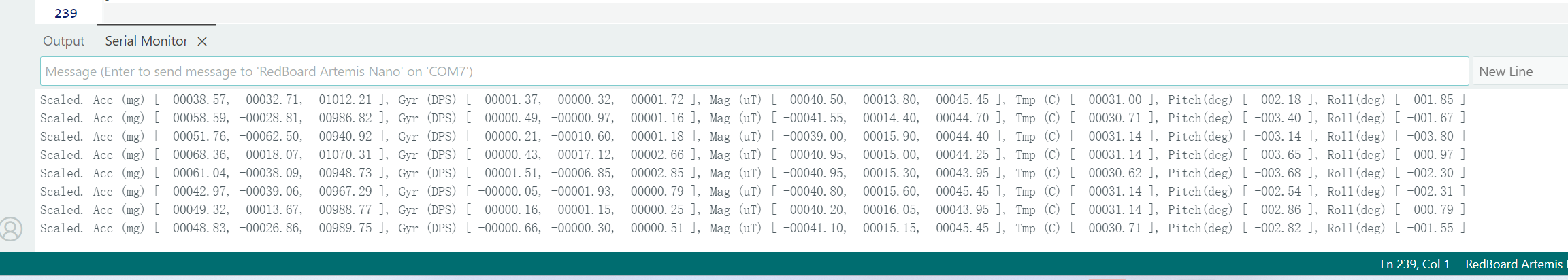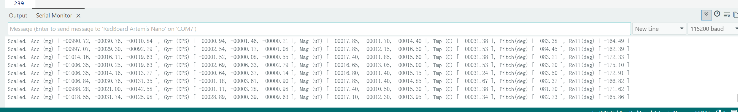 From the serial output, it can be observed that when the accelerometer Acc (mg) is stationary, one axis is close to ±1000 mg (≈1g), and the other two axes are close to 0. When the board is flipped or its orientation is changed, the axis close to ±1000 mg will switch between x/y/z, and may change from positive to negative. Rapid movement or a tap will cause a brief deviation due to superimposed linear acceleration.