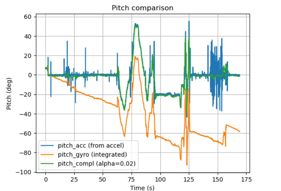 Figure 19 Pitch comparison (accelerometer vs integrated gyro vs complementary filter) In Figure 19, the accelerometer-based pitch is stable in quasi-static segments but exhibits spikes during taps/motion. The gyro-integrated pitch responds smoothly to rotation but shows noticeable drift over time. The complementary filter (alpha = 0.02) tracks the accelerometer baseline while suppressing high-frequency accelerometer noise and limiting gyro drift, producing the most stable estimate.