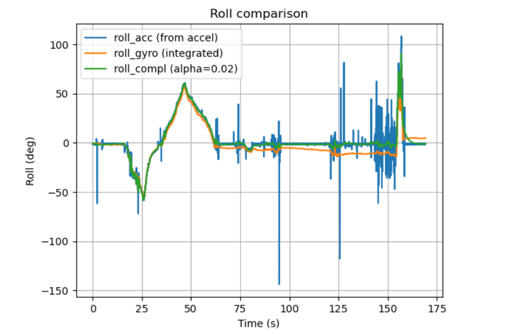 Figure 20 Roll comparison (accelerometer vs integrated gyro vs complementary filter) Figure 20 shows the same trend for roll: accelerometer roll contains occasional impulsive outliers, gyro roll is smoother but slowly diverges, and the complementary filter yields a smoother trajectory that remains close to the gravity-referenced roll during slow tilts while rejecting tap-induced noise.