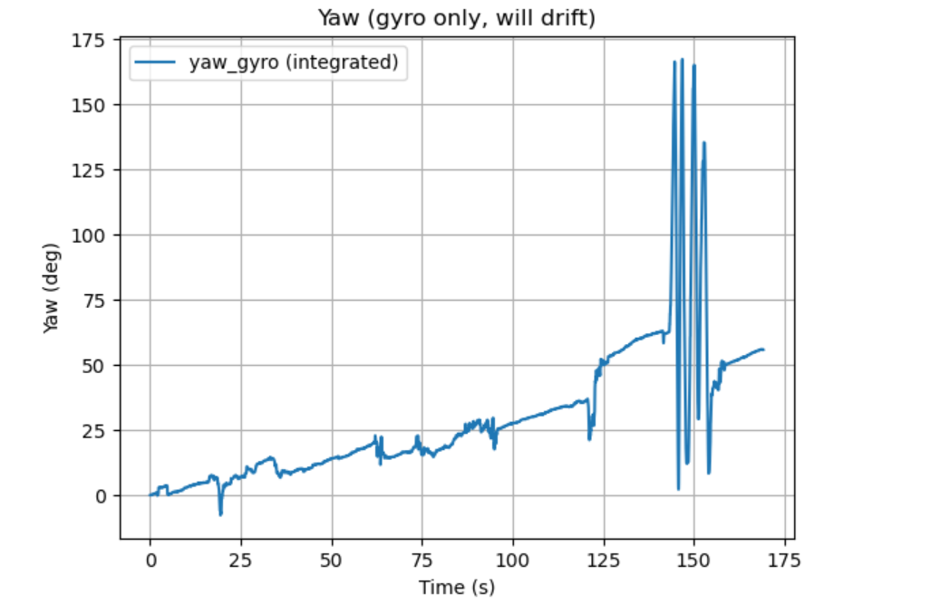 Figure 21 Yaw from gyro integration (demonstrating drift) As shown in Figure 21, yaw was computed by integrating the gyro z-rate; unlike pitch/roll, yaw does not have a gravity-based accelerometer reference, so the integrated yaw accumulates bias and drifts over time, especially after disturbances and sustained rotation.