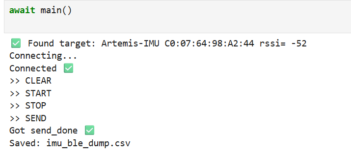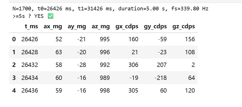 The recorded run satisfies the requirement: duration=5.00 s and the check reports “≥5s: YES” (Figure 25). The dataset was successfully sent over BLE and saved as imu_ble_dump.csv> (Figure 24).
