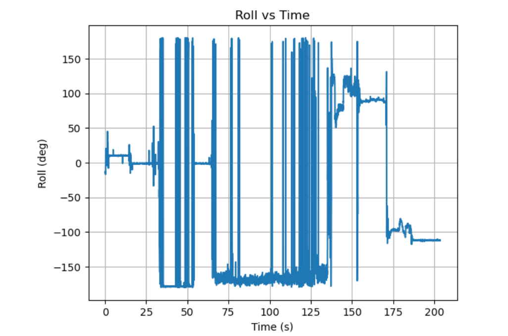 Gyroscope angular rates were integrated over time using the class equations to obtain pitch, roll, and yaw. During data collection, the IMU was rotated slowly through different angles (to create smooth attitude changes) and lightly tapped/knocked (to introduce brief vibration/impulse disturbances).