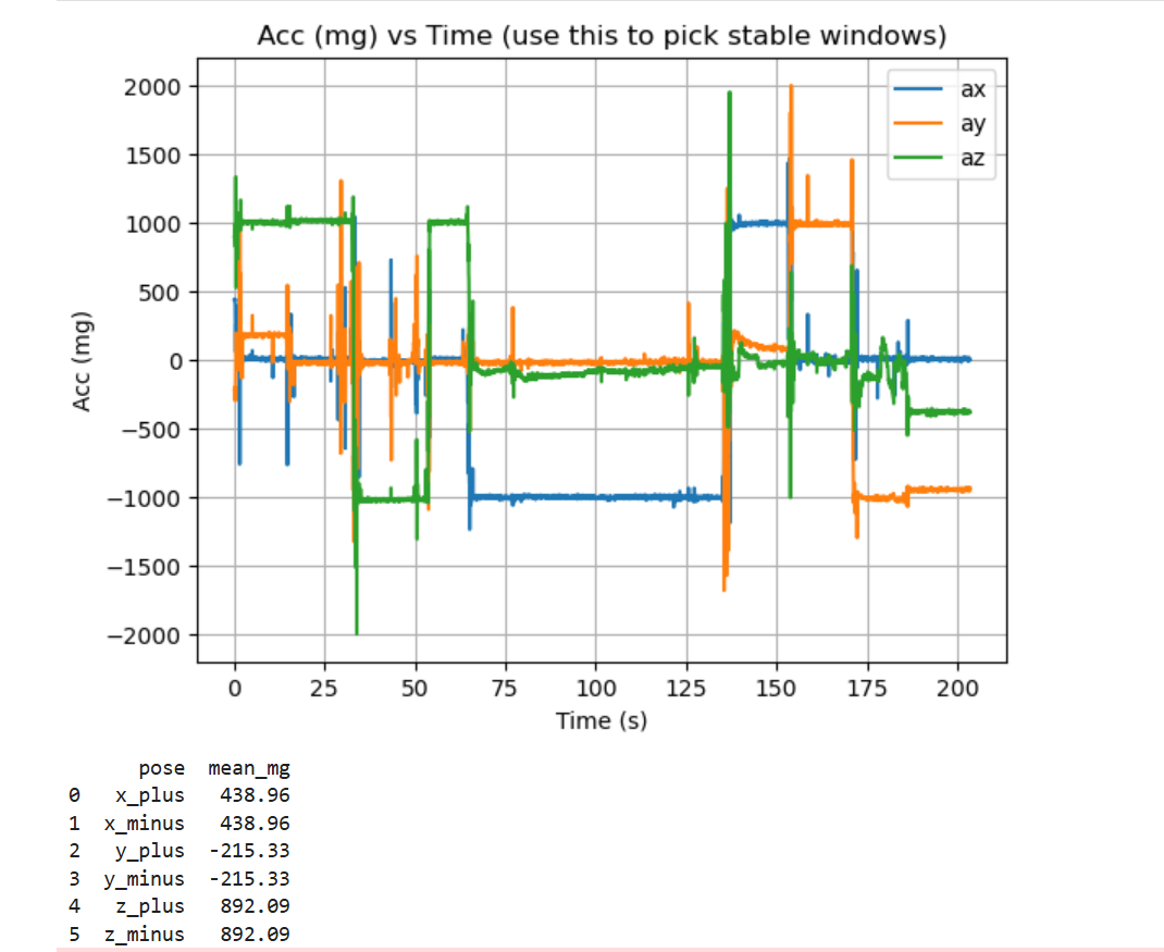 A per-axis two-point calibration (linear scale + offset) was then applied using the measured +1 g and −1 g endpoints. The fitted parameters were: X: k=1.0022, b=−2.42 mg; Y: k=1.0023, b=−6.34 mg; Z: k=0.9907, b=−8.66 mg. After calibration, the gravity-magnitude mean moved closer to the ideal 1000 mg (from 1013.94 mg to 1011.76 mg), while the overall standard deviation changed only slightly (70.58 mg to 70.22 mg), indicating calibration mainly corrects static bias/scale error and the remaining variation is dominated by motion/transition segments.