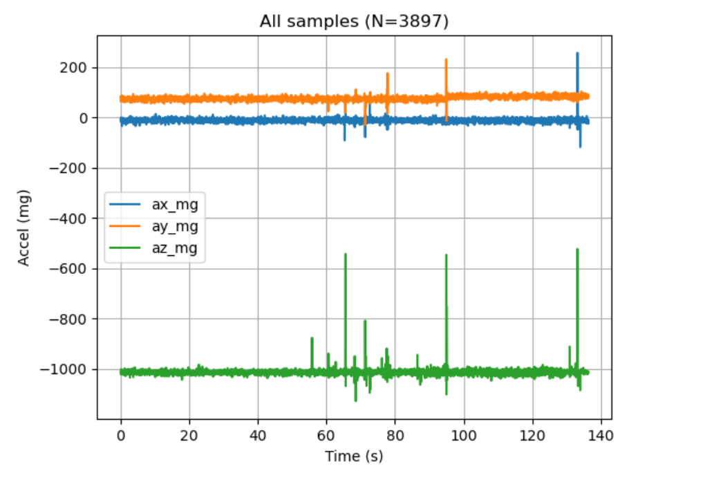 Figure 8 Sample Preview and Logging Summary (N=3897) # Data cleaning: keep only valid 6-col CSV rows, coerce to numeric, build t_s import pandas as pd CSV_PATH = "data2.csv" cols = ["t_ms","ax_mg","ay_mg","az_mg","pitch_deg","roll_deg"] rows = [] with open(CSV_PATH, "r", encoding="utf-8", errors="ignore") as f: for line in f: s = line.strip() if not s: continue parts = s.split(",") if len(parts) != 6: continue if parts[0].strip() == "t_ms": # skip header continue if parts[0].startswith("Initialization"): # skip init line continue rows.append(parts) df = pd.DataFrame(rows, columns=cols).apply(pd.to_numeric, errors="coerce") df = df.dropna().reset_index(drop=True) df["t_s"] = (df["t_ms"] - df["t_ms"].iloc[0]) / 1000.0# Plot: accel axes vs time import matplotlib.pyplot as plt x = df["t_s"].to_numpy(float) ax = df["ax_mg"].to_numpy(float) ay = df["ay_mg"].to_numpy(float) az = df["az_mg"].to_numpy(float) fig, a = plt.subplots() a.plot(x, ax, label="ax_mg") a.plot(x, ay, label="ay_mg") a.plot(x, az, label="az_mg") a.set_xlabel("Time (s)") a.set_ylabel("Accel (mg)") a.set_title(f"All samples (N={len(df)})") a.grid(True) a.legend(loc="best") plt.show()Code Snippet (Gist)